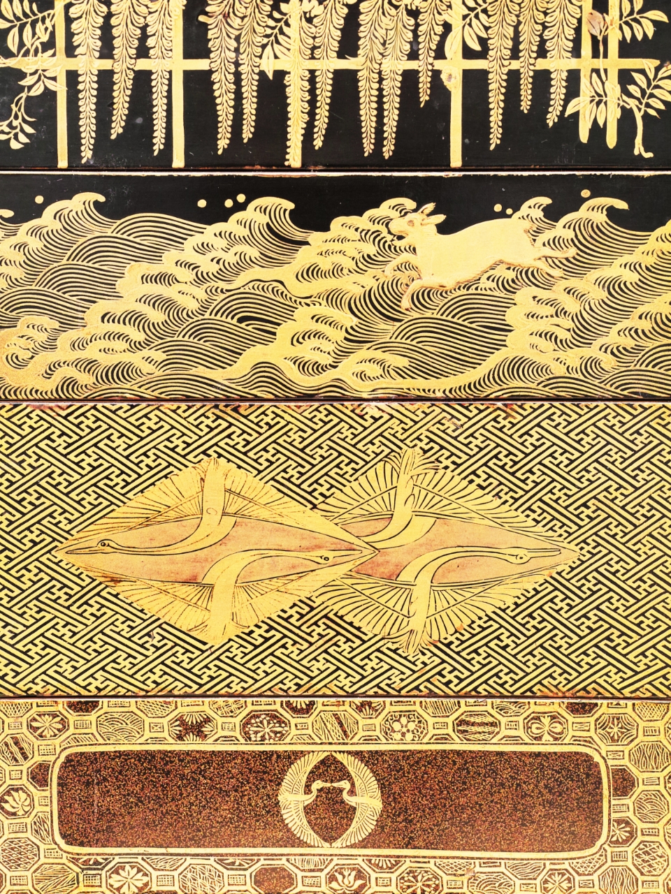 漆に金粉や銀粉を蒔いて装飾をほどこす日本のゴールドアート「蒔絵(まきえ)」は奈良時代の正倉院宝物である「 金銀鈿荘唐大刀(きんぎんでんそうからたち) 」の鞘の装飾に用いられた「 末金鏤(まっきんる) 」が始まったとされ、その後、日本文化 1000 年以上 通じてつねに最高の美の象徴でした。